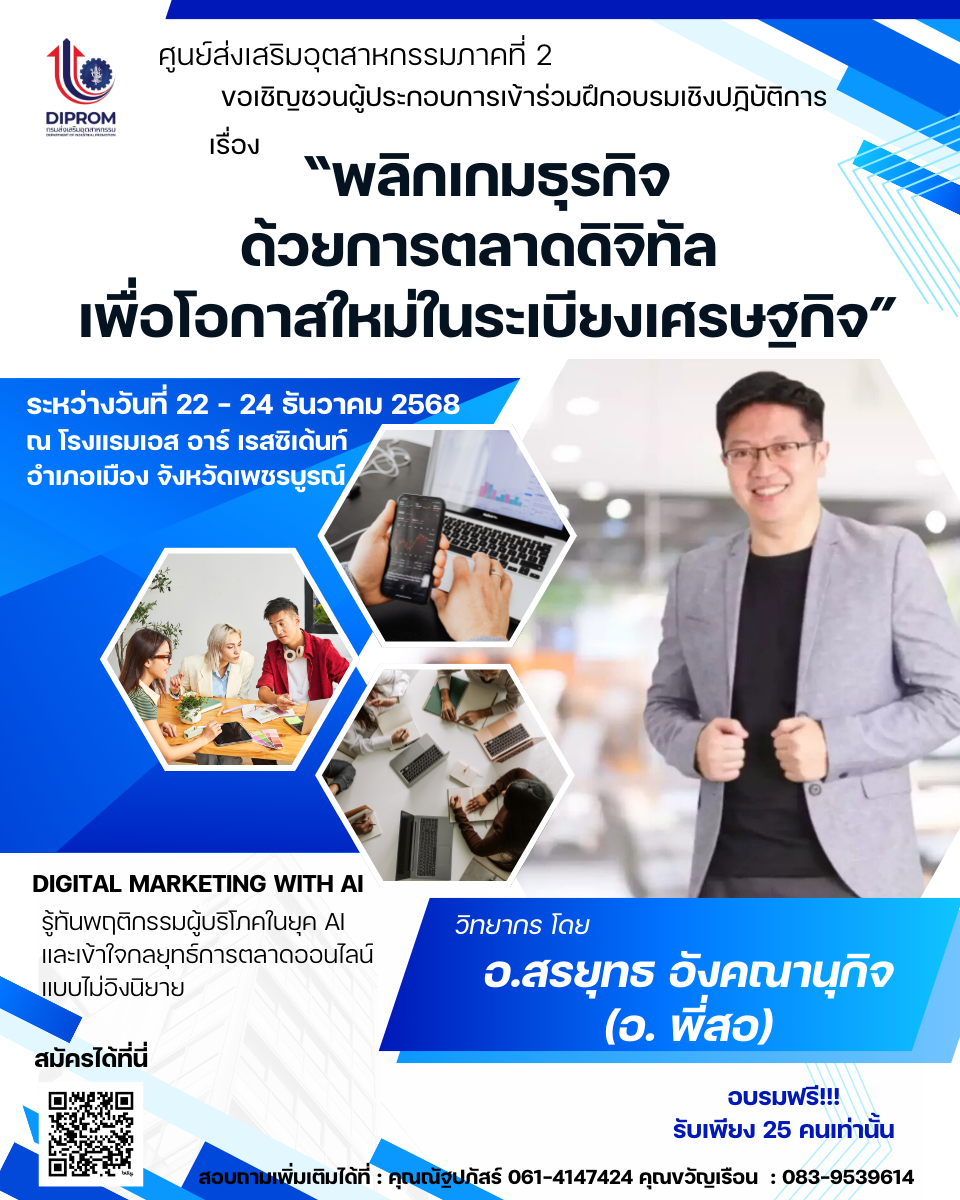 ศูนย์ส่งเสริมอุตสาหกรรมภาคที่ 2 ขอเชิญชวนผู้ประกอบการเข้าร่วมฝึกอบรมเชิงปฏิบัติการ เรื่อง